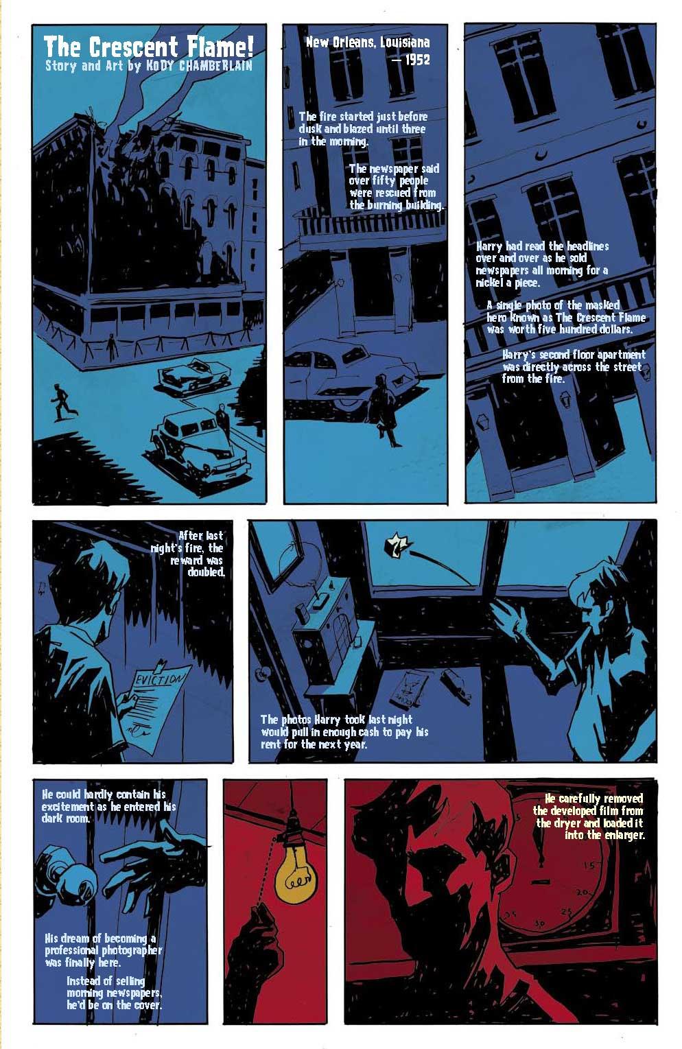 The Crescent Flame by Kody Chamberlain (also from P.U.N.K.S) is set in New Orleans in 1952. A young man by the name of Harry managed to capture a photo of The Crescent Flame’s latest heroic act and now has to face the consequences. More like an illustrated prose piece told in third person, in the style of an old radio serial, it’s a nice departure from the rest of the more traditional stories before it. Rendered in blue for exteriors, and red for the dark room scenes, it’s also an effective showcase of moody colouring.