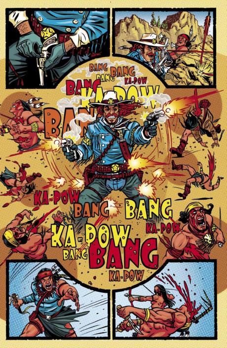Joshua Fialkov (the madcap P.U.N.K.S) with glorious old-school art by Andy B, craft an obvious Lone Ranger homage with their story about Newt Lawman and Running Bear as they make a stand against some angry Apaches. The standout here is the art. Reminiscent of Mike Allred, it’s all grand gestures in technicolour. I’d love top see more of this guy.