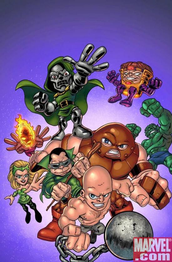 After the hero-centric teaser image, we now have a villain-centric piece. It is accompanied only with the text, “Are You Ready To Villain Up?” It seems obvious now that these two images are to promote Marvel’s kid friendly cartoon, or comic, or both, probably to go along with Hasbro’s kidified Super Hero Squad toys. For now, gaze at the cutesiness of Juggernaut, Doctor Doom and the little limbed/ big headed awesomeness of the always fun M.O.D.O.K.