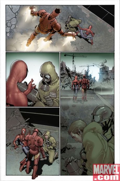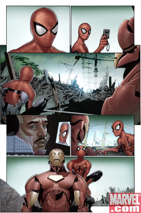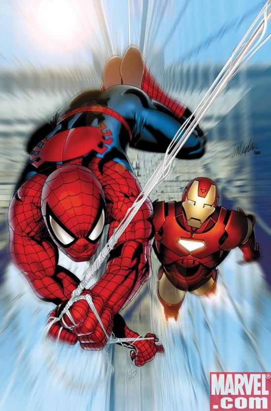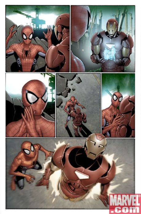 More pretty pictures. This time from Invincible Iron Man, Tony Stark’s second title. It’s a great time to be a goateed gazillionaire inventor. Written by Matt Fraction with art by Salvador Larocca issue 7 (released on November 5) has Iron Man teaming up with Peter Parker AKA Spider-Man. Two cinematic heroes in one book. Cool.