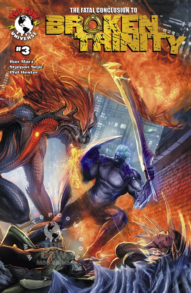 Writer Ron Marz and artist Stjepan Sejic continue to work beautifully together. Sejic renders the battle in glorious fashion, and had me wishing that the last episode of Angel looked like this. His painterly effects are always pleasant on the eye, and here he seems to be bold enough to experiment with layout and page design. Hopefully, he’ll continue to. Marz proves he’s the master of simple action yet again. There are some big (and not entirely original) ideas at play here, but he knows how to make a comic accessible. Secret Invasion and Final Crisis are just as grand concepts, but Broken Trinity achieves the same level of comic book soap opera with less issues, and characters. If you’re a fanboy who doesn’t know what to give a newbie, anything written by Marz will be a sure thing, as the experienced scribe entertains without confusion every time. The last few pages are a treat too, and herald a new direction for the characters in its pages. Where Top Cow take those left standing after this event should be just as interesting to watch.