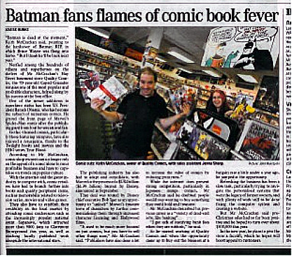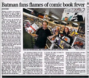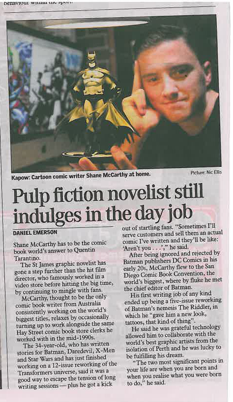 My local newspaper, The West Australian is usually pretty good with comic book coverage, and here in the sunny side of Oz (actually it’s pretty much all sunny) we’ve had a good run of successful comic creators, with Ben Templesmith (30 Days of Night, Wormwood: Gentleman Corpse) and Shane McCarthy (All Hail Megatron) being the obvious stars. Last week The West ran 2 comic stories in 2 days, by 2 different journos. Cool. One was on writer McCarthy and the other article was in the business section and centred on local store, Quality Comics. You can read that article here. Gone are the days of BIFF! and POW! being stamped on anything comic related, though they do call McCarthy a “cartoon comic writer.” Man…I don’t understand why people get those two terms mixed up. Cartoons are animated and on TV screens or the cinema. Comics are static and are printed on paper. Lesson over. Hopefully when the Arcana mag launches next month they’ll give us a nod though!