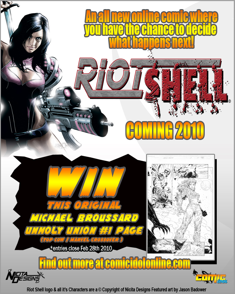Nicita Designs and Comic Idol Online are holding a “BE PART OF RIOT SHELL CONTEST” Where fans can be part of the online comic by entering there original pin-up artwork of the Riot Shell Character to fans@comicidolonline.com , There are six spots available to be filled in the online comic by fans.