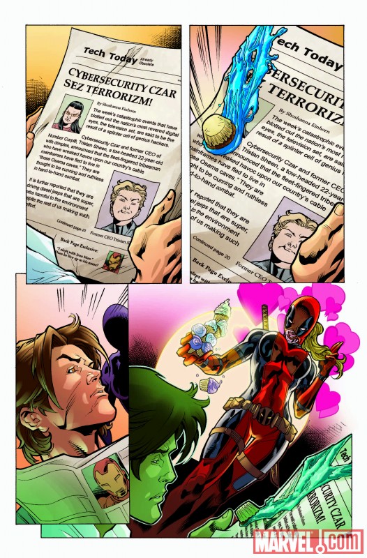 Yes, the wisecracking ‘merc with the mouth’ is Marvel’s current favourite child, with more guest appearances and spin-offs than almost Wolverine. At least they’re not taking it too seriously though. Text-free preview of Lady Deadpool’s debut ish below.