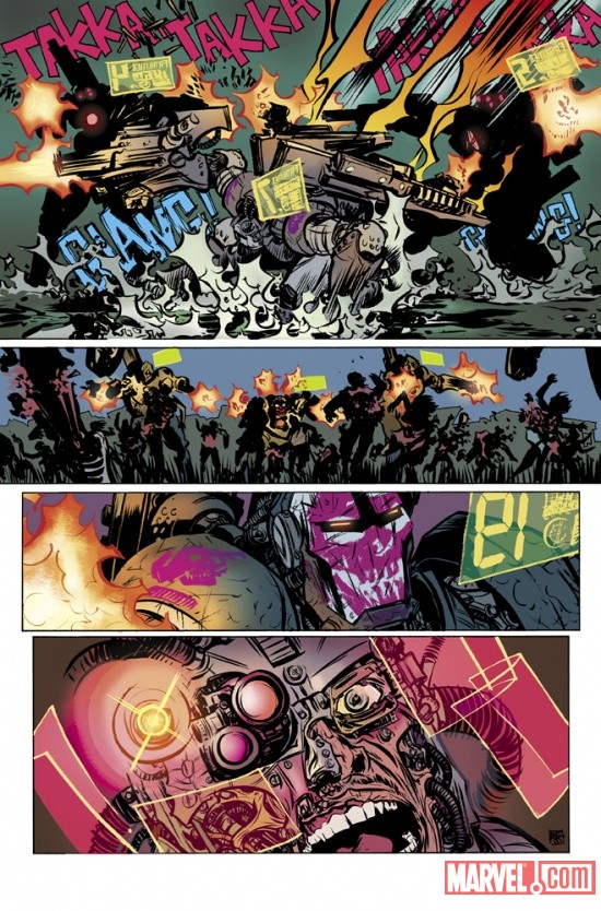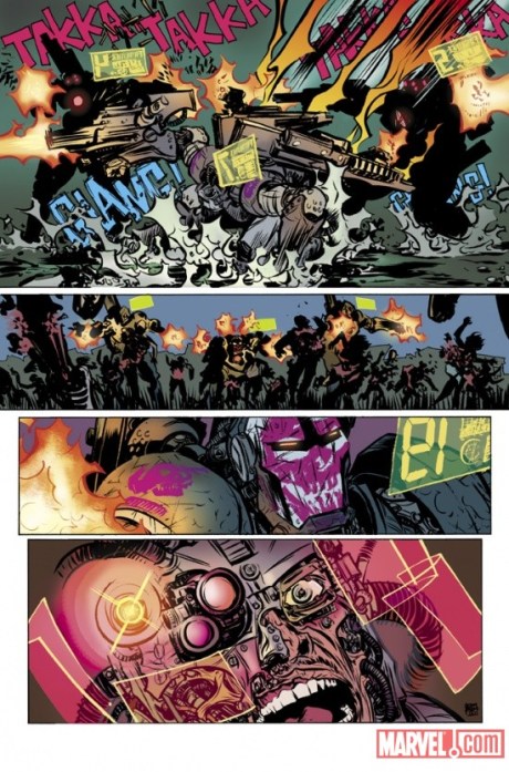 Below is a look at a few text-free pages from different artists from the landmark 500th issue of Iron Man.