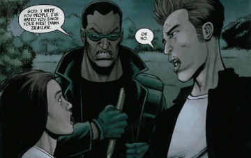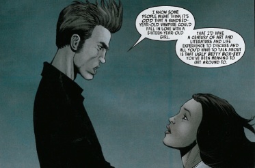 Another writer having some fun at Twilight’s expense is Mark Millar. In the first 3 pages of last week’s Ultimate Comics Avengers 3 #4, with art by Steve Dillon, Blade is stuck in a sewer and, having just been bitten by new vamp Captain America, starts hallucinating about two lovers staring meaningfully at one another in “Twilight Falls.” “Stella” asks “Edgar” to stare at her. “Intensely?” he asks. “As intensely as you dare,” she pouts. Ah, great stuff.
