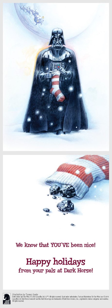 I’m listening to Christmas carols as I write this. They always put me in a good mood. Anyway, here’s a snazzy gallery over at Broken Frontier featuring some new Christmas cards from a few publishers and artists. This one from Dark Horse is my fave.