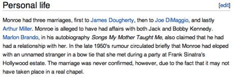 In one of those aforementioned time travels, the Doctor attended a party at Frank Sinatra’s house and became surprisingly engaged to Marilyn Monroe, not that we see her. It’s a throwaway joke, but obviously fans of the show latched onto it and exercised their power to alter Monroe’s bio on Wikipedia! Classic.