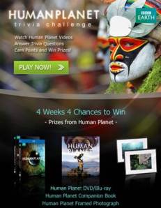 To support the series, BBC has launched an official Facebook page, featuring the new game Human Planet Trivia Challenge. Challenge friends, race against the clock, and see if you have what it takes to top the leader board. Each week we will be giving away incredible prizes including Blu-ray/DVD copies, framed photos, and award winning books.