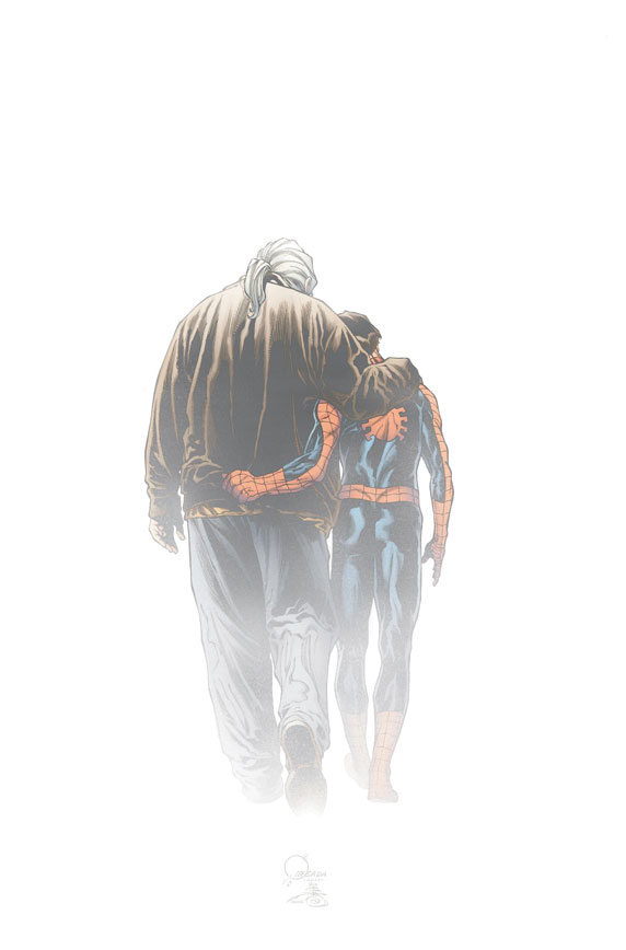The Ultimate version of Spider-Man is dying, to be replaced by someone other than Peter Parker with new duds. Here’s a look at the variant covers by Marvel head honcho Joe Quesada, with Peter walking along with his beloved Uncle Ben to the afterlife. The ish goes on sale June 22.