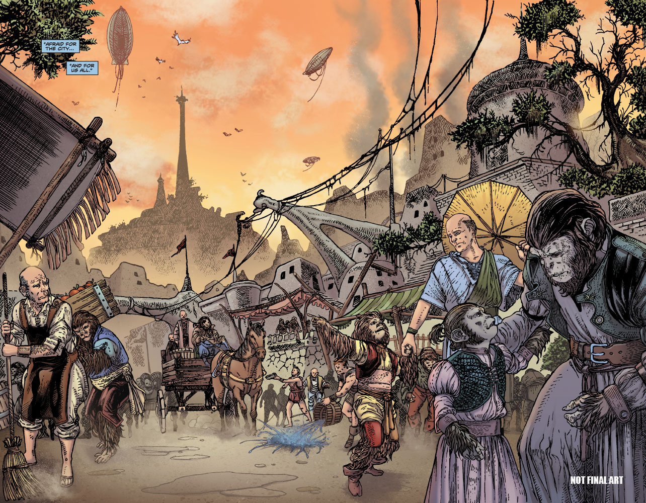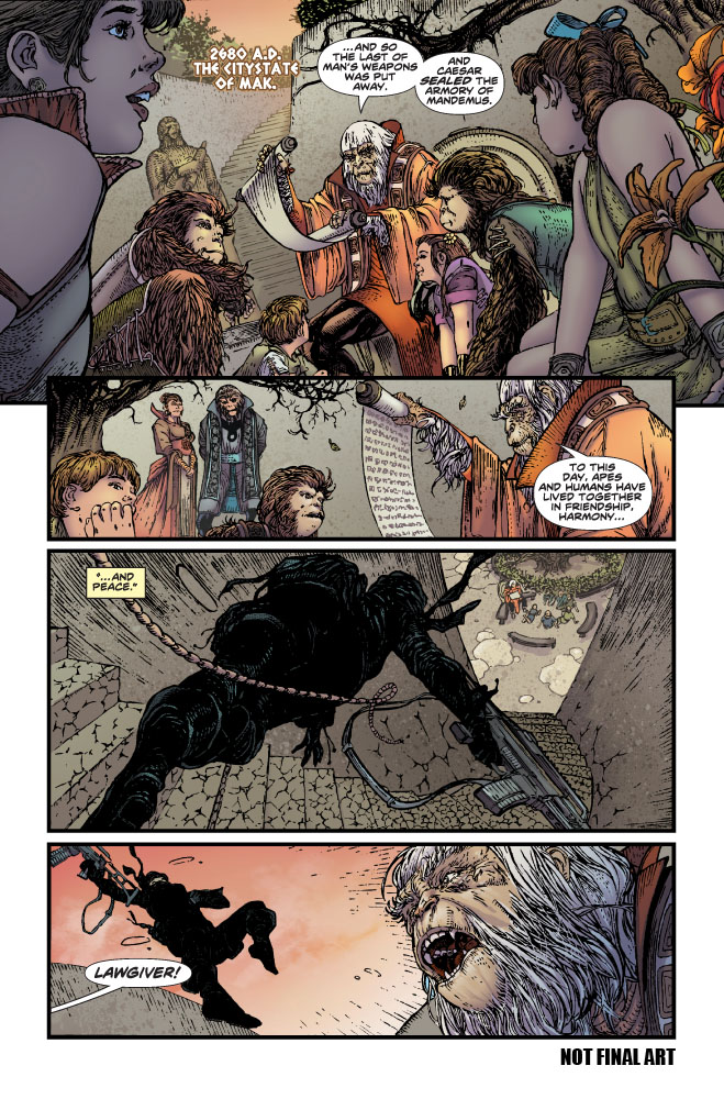 Taking place before the original 1968 PLANET OF THE APES movie, but true to the continuity of the first five films, this new ongoing comic series begins in a time when Ape society reaches a new golden age. But there are ripples of dissent in both the ape and human ranks. Tensions will rise and soon all will be caught in chaos! And amidst all this uncertainty, what is the fate of…The Lawgiver? Find out as a new chapter of the acclaimed sci-fi classic, PLANET OF THE APES, begins this April!
