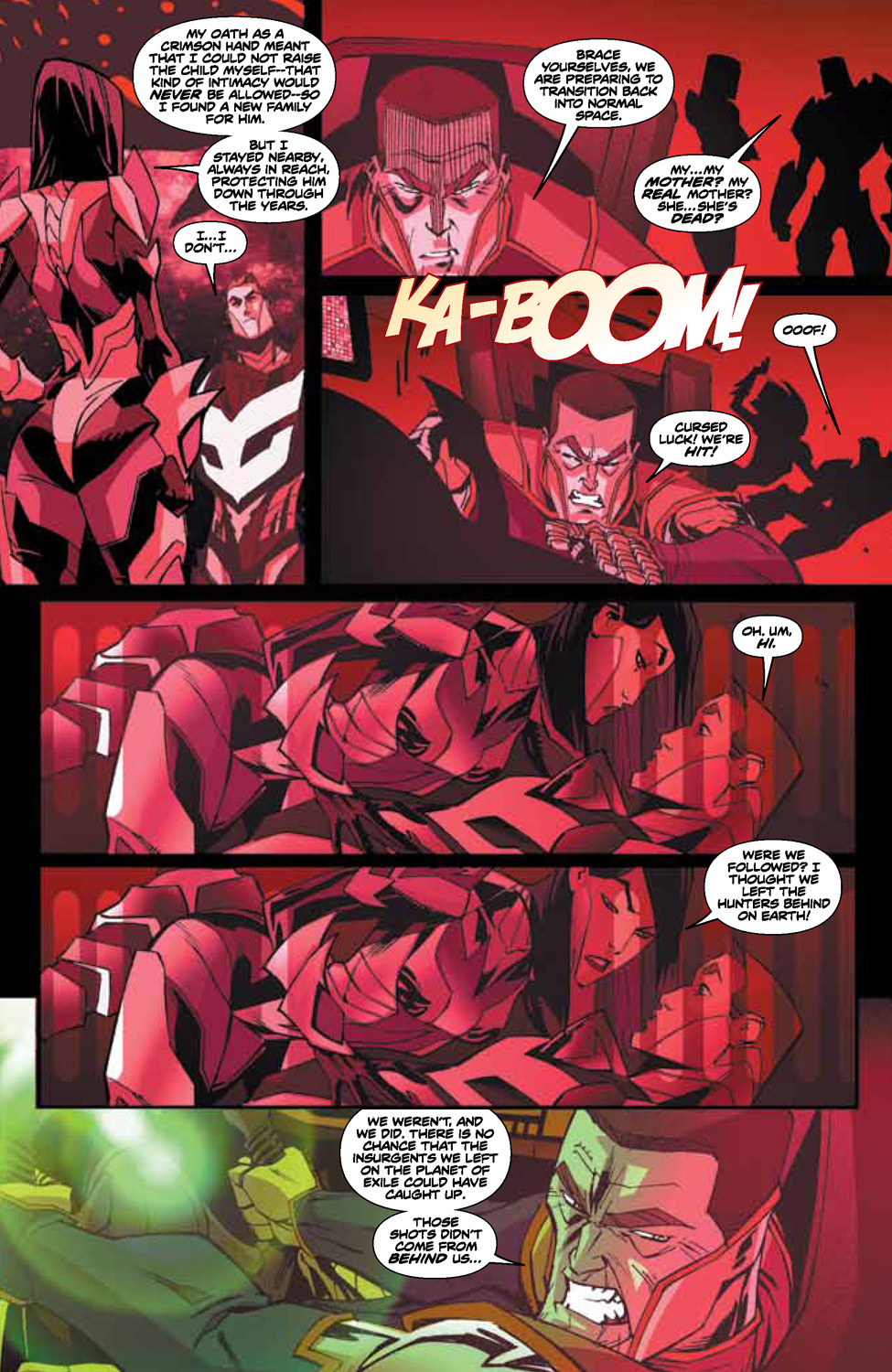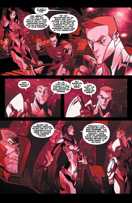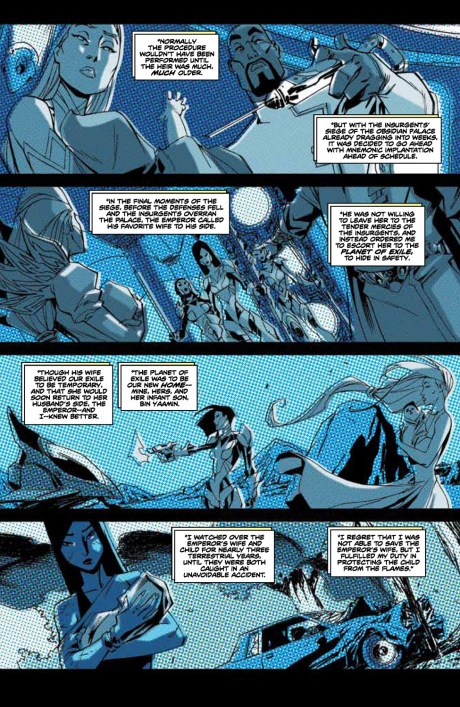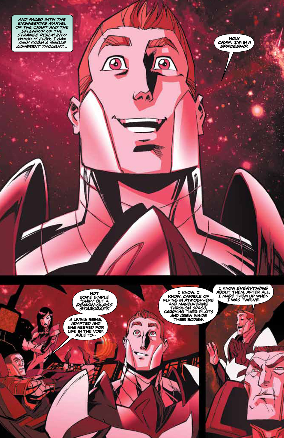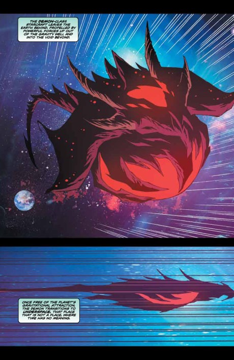 As this ish begins, Benjamin in a fancy space suit, Tara and a sceptical General Cur are inside Demon, living spaceship hurtling through space trying to come to grips with how, or if, Ben’s mind has created what he’s living, before getting attacked. On earth a few cool looking aliens, led by a dreadlocked female surmise that Tara’s group, Crimson Hand hid their advanced technology on earth before fleeing and Demon lands on mining planet to heal. While a disguised Tara haggles for supplies, Ben saves a woman and her child from an angry, whip wielding local and Ben learns that A. His hi-tech suit is full of surprises and B. For some reason he’s known on this world, and isn’t popular at all.