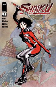 Shinku #1. I remember seeing black and white preview pages for this ages ago and being eager for the finished product. Now, this creator owned series from writer Ron Marz and artist Lee Moder is out. Part 1 of Throne of Blood, there’s certainly plenty of the latter in these pages. If you like your vampire action more in the throbbing vein of Kill Bill and less like Twilight, grab this. It starts with Davis, a newcomer to Tokyo who gets lucky at a nightclub, when a (very forward) woman bares her…fangs. Davis is rescued by a motorcyclist in a cool crimson suit (yep, Shinku) and is opened up to her tough secret world of vamp killing by bloody means. Within her cool hideout Shinku reveals that she’s the last of her samurai clan (complete with a nifty sepia flashback) before we see her nemesis who has had enough of her actions. This is a mature comic, so be warned. It’s a simple story, of the kind that’s been told many times – outsider becomes embroiled in an ancient war, yet it does work here and Marz and Moder’s bold take is worthy of attention.