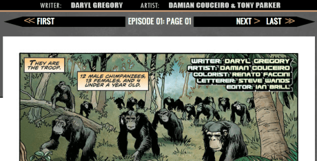 If you can’t wait until then, you might want to check out the just launched Apes webcomic, which updates every Wednesday and is written by the man behind BOOM!’s series, Daryl Gregory.