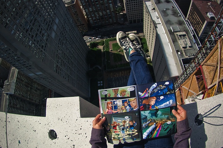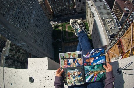 Stumbling across this photo in a series of similar sky scraping images, I immediately recognised that upon the subject’s legs sat an issue of Marvel’s all-ages superpowered siblings team, Power Pack. Yes, you should be impressed that I know that.