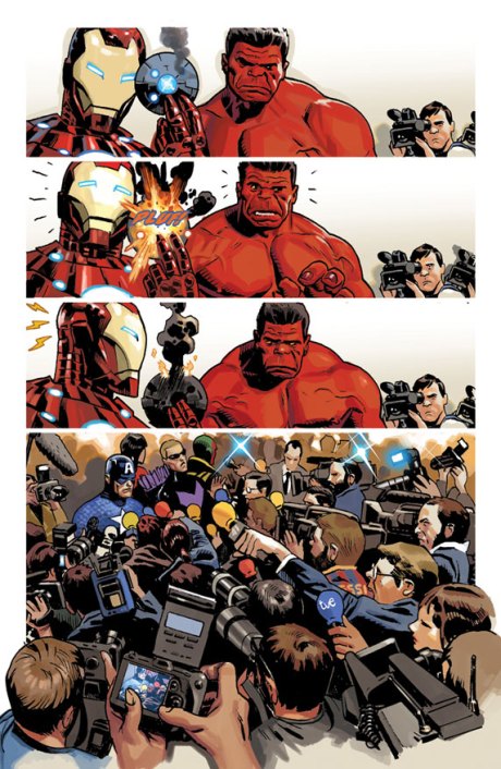 Next up is a future set Age of Apocalypse tale in which mutants rule and humans are the hunted species. David Lapham’s scripts works with Roberto De La Torre’s slightly gritty pencils to present an interesting tale that does very well to present a handful of new characters in as many pages. The Scarlett Spider and Yin and Yang tales are OK, but Matt Fraction’s and Terry Dodson’s Dr Strange story gives us a look at December’s The Defenders series (which I’m looking forward to, only because of the creators) and Brian Michael Bendis and Bryan Hitch show Spider-Man and Hawkeye fighting a losing battle against a few vicious Ultrons in their intense style.