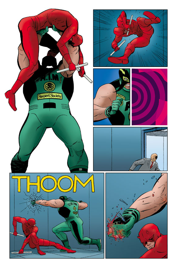 Mark Waid (KIngdom Come, and a whole lotta other stuff) is one of my favourite writers. Marcos Martin is a great artist responsible for Batgirl: Year One (the mini that the topic of our last podcast, Chuck Dixon, wrote). Together they create stuff like this, as seen in the text-free pages below of this month’s ish of Daredevil. Martin has a real flair for lively, ’60s trippy kinda art.