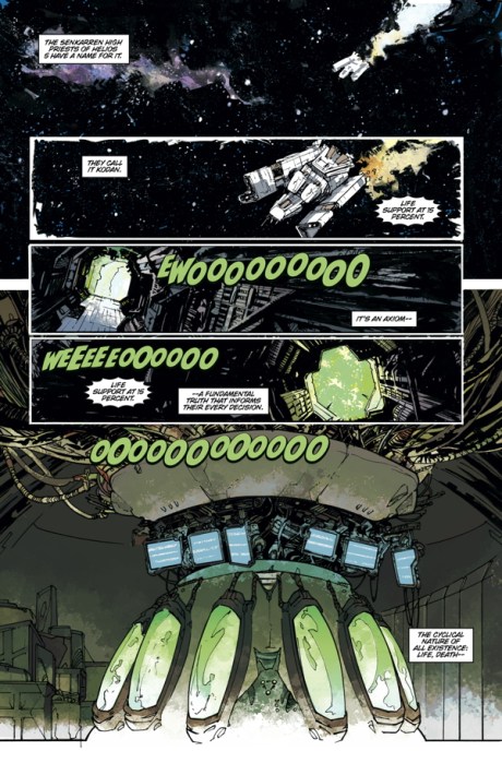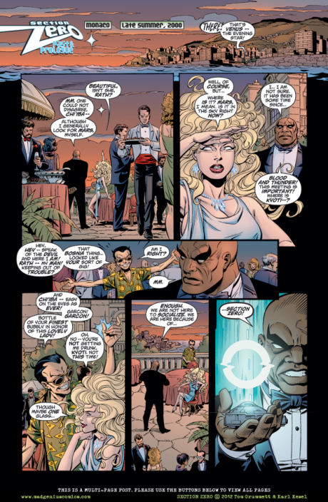 Kesel assures new readers “the web comic starts at the beginning. We launch with a 5-page Prologue on Monday, January 2nd, then we’ll post the first 3 issues of Section Zero, 3 pages every Thursday. Once that’s done, it’ll be all new material. And that gives us the time we need to make that new material!” Fans who have read the original comics will still want to check out the postings. “I’m tweaking the dialogue a bit here and there— partly to make it read better, partly because my idea of what the story’s about has changed slightly over the years. Plus, Richard Starkings at Comicraft— who is insane in the best possible way— insisted on ‘freshening” the lettering— so we’ve got a new font and new placements and the book has a slightly different look.”