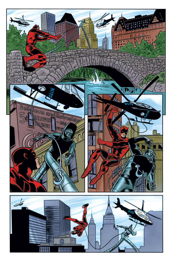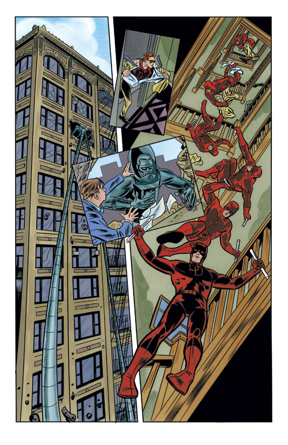 How could I not share this? Mike Allred, he of the kooky and unmistakable visual style, is drawing August’s issue of the award winning Daredevil monthly series, with weird villain Stilt-Man included for no extra charge. A few pages below.