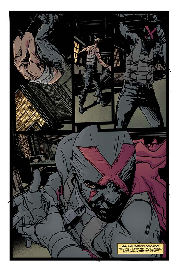 The scare tactics that X employs are great, and offer fair warning to his victims. Low-lifes in Arcadia receive a warning– a photo of their face with a single red x on it. If they don’t change their ways, they get a second one, which means death. There are a lot of deaths here, as corrupt figures always have plenty of henchmen, bodyguards and corrupt cops to go through the meat grinder. X is no superhuman, in that he takes many beatings and proves that he’s not indestructible, but the action and pacing is of a high class Hollywood action film quality, only with more of the red stuff. It never quite goes over the top in to the laughable category, but there’s enough smart, thought out frenetic scenes of violence here to make the reader wince.