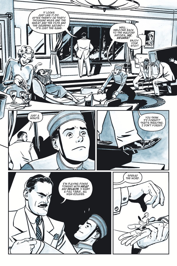 Every page here is filled with elegant lines and clean expressions, befitting the classiness of the Waldorf Astoria of the era. Expressions are animated yet realistic, which is difficult to achieve but Case gives Kevin Maguire a run for his money. It’s more than just spot on expressions though, that sell a character and with a complex tale like this one, the story demands more. Case brings all the players in at the right time and the right way to give them a memorable impact to the narrative, as well as making the reader curious as to how they’ll all fit in to the larger story being told.