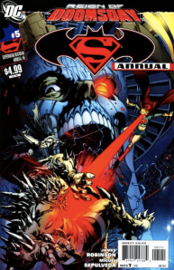 Superman/Batman Annual #5 – Reign of Doomsday. Superman’s spiky killer Doomsday has been doing the rounds in a few DC titles lately, and this annual picks up after JLA #55 and continues in Superboy #6. It features great art by Miguel Sepulveda, which looks kind of like a cross between Phil Jiminez and Jae Lee. James Robisnson writes this action packed issue. Despite the title, it doesn’t really feature Bruce Wayne and Clark Kent, but rather Dick Grayson as Batman, and Supergirl. For most of the tale Kara (initially in her black costume) is stuck in safety of sick bay in the JLAWatchtower base as she’s sick. After receiving a diagnosis from Dr Mid-Nite and advice from Dr. Fate, (or rather the man under the golden helmet, Kent Nelson), she gets her health and classic costume back and begins punching. Most of the action here is between cyborg Superman and Doomsday, as Cyborg Supes uses the Watchtower itself as a weapon. Doomsday however easily adapts to the attack and becomes Cyborg Doomsday, seen in an awesome double page transformation. Driven mainly by Cyborg Superman’s death wish narration, and a brief Dick and Kara team up inside, it also Blue Lantern Saint Walker and Mikaal Starman are stuck outside and see the Watchtower transform first into Cyborg Supes’ face and then DD’s. Sure it’s in the middle of a story arc I’m not following, but it looks great and Cyborg Supes has always been one of my fave DC bad guys.