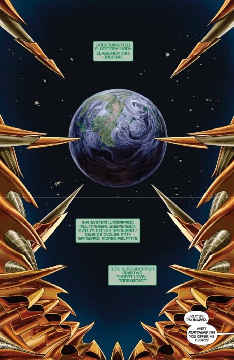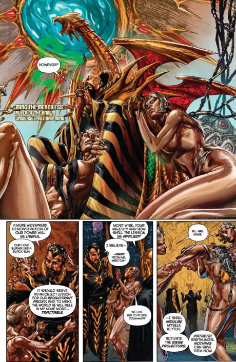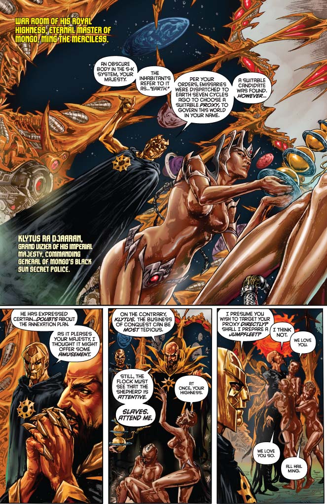 Artist Alex Ross (Kingdom Come) has long been a fan of the character and an interview with him even shows up on the DVD of the 1980 film. His love is evident here in his character designs and art direction, a role (as well as variant cover artist) that has kept him busy with numerous series over the last few years at Dynamite. Not as outlandish as his designs for the Jack Kirby inspired titles, they evoke classic sci-fi trappings much like the rockets and alien thrones do. Throwing Ming’s snivelly right hand man Klytus from the film was a nice surprise too, and Ming really lives up to his Merciless title, with his disdain for pretty much everyone, including his slave girls and the entirety of the human race it would seem. More of  a nuanced character and not at all a stereotype, Ming is like Darth Vader in Episode IV. We don’t see much of him, but we see enough to know that he’s a calculating despot.