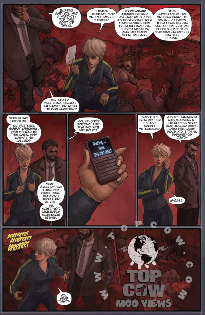 There’s only 10 story pages in this preview book, but it’s certainly a meaty start. Writer Jonathan Lincoln introduces us to not only O’Roark, but his girlfriend, boss and fellow cops, all while creating distinctive voices for them all. There’s no big reveal of Herod or the werewolves that are hinted at, but there’ll be plenty of time for such when the series kicks off proper. Francis Tsai’s art works well, and his colouring deserves to be mentioned. From the red glare of the bus massacre to the bright lights of the police precinct and hospital he makes each scene diverse enough to be interesting, and it’s all entwined with a subtle painterly approach.