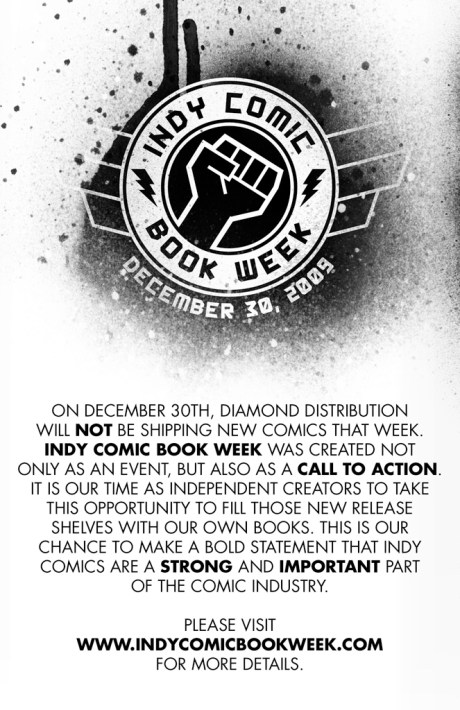 There’s a so-called skip week this year, in which no new comics will be delivered to your LCS from Diamond Distributors on the last week of December. The week of December 30th this year now means that this is the time to strike for independent publishers. There’s a handy blog right here devoted to it to aid you if you’re an indie creator hoping to promote your wares or a retailer hoping to help.