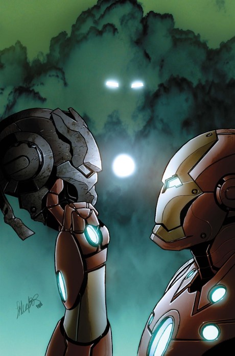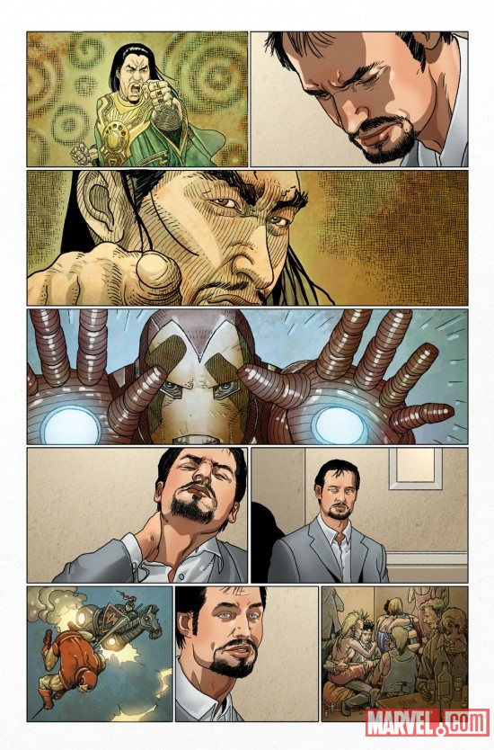 Marvel is pleased to present your first look at the landmark anniversary issue, Invincible Iron Man #500! From the Eisner Award winning creative team of writer Matt Fraction and artist Salvador Larroca– along with special guest-artists Kano, Nathan Fox and Carmine Di Giandiomenico– the Armored Avenger’s past, present and future come together for a mind-bending tale that brings together three generations of Starks! Is Tony Stark the man responsible for the dystopian world of tomorrow? Is his son really the relentless mass murderer known as War Machine? What awful fate awaits his freedom-fighting granddaughter as she slips into the clutches of the Emperor of the Earth, the vaunted Grand Khan…the Lord Mandarin?!