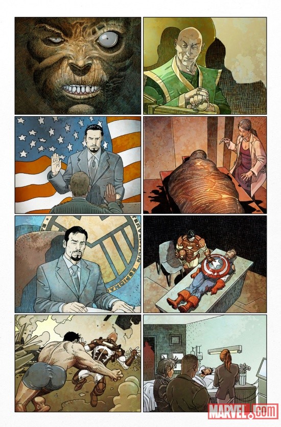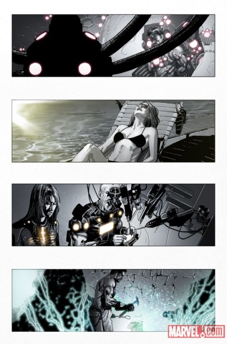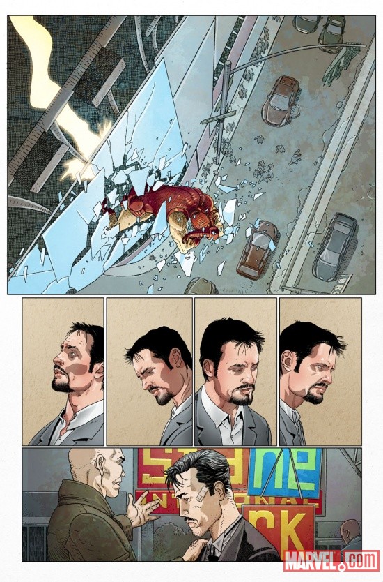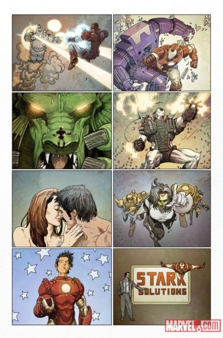 Below is a look at a few text-free pages from different artists from the landmark 500th issue of Iron Man.