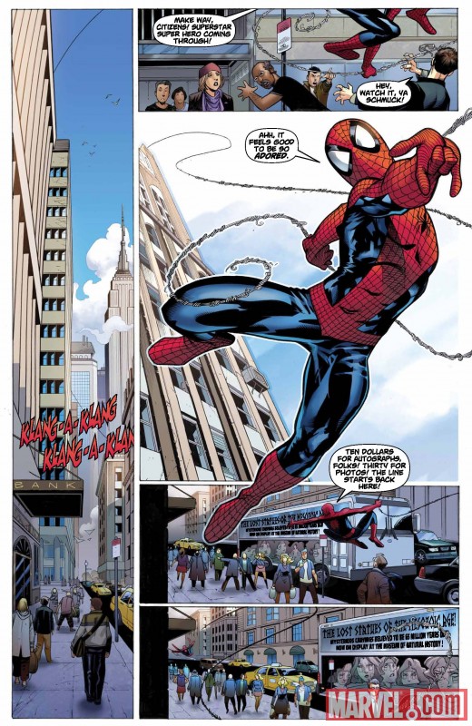Here, it’s the turn of Red Hulk (former enemy of Hulk, General Ross) as they finish fighting a massive robot with a few other Avengers, before Ross gives Spidey a lift back to New York, in a most humiliating fashion. Of course, they arrive just in time for an invasion by the subterranean Moloids, who kidnap New York’s new mayor (and Parker’s old boss), J. Jonah Jameson. This ish is mostly fight scenes, including Hulk destroying a flock of seagulls, and a double pager of a mass of Moloids jumping on a mass of marathon runners, so it means it’s slightly unsatisfying due to it being a quick read. Perfect for newbies though, as this ish (and assumedly, all future ones) consists of a neato intro summarising who Spidey and this new red Hulk are.