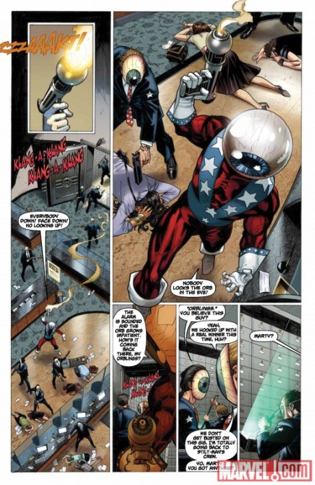 Next up is a future set Age of Apocalypse tale in which mutants rule and humans are the hunted species. David Lapham’s scripts works with Roberto De La Torre’s slightly gritty pencils to present an interesting tale that does very well to present a handful of new characters in as many pages. The Scarlett Spider and Yin and Yang tales are OK, but Matt Fraction’s and Terry Dodson’s Dr Strange story gives us a look at December’s The Defenders series (which I’m looking forward to, only because of the creators) and Brian Michael Bendis and Bryan Hitch show Spider-Man and Hawkeye fighting a losing battle against a few vicious Ultrons in their intense style.